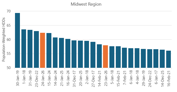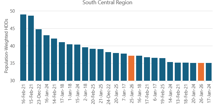 While forecasts point toward January 25 and 26 both ranking in the Top 25 coldest of the past 10 years, population-weighted degree day totals are currently forecast to peak at just 37.2, compared to extremes near 50 during Winter Storm Uri in February 2021.