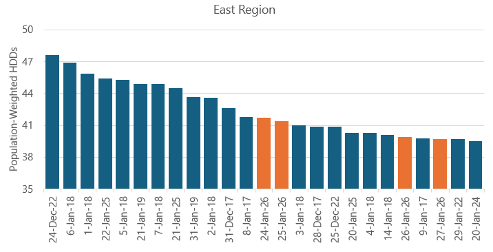 Cold weather is expected to peak in the East Region on January 24 as well, with only a slight warmup anticipated for Sunday the 25th through Tuesday the 27th. This four-day stretch will be very impactful for spot energy pricing across the nation’s most populous region, although the extremes in weather are still expected to fall short of what was experienced around this same point in January 2025.