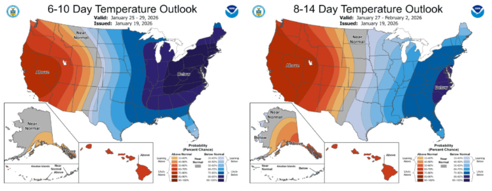According to the most recent forecasts, on a U.S. population-weighted basis, the coldest days in the upcoming outlook will be this upcoming weekend, January 24 and 25. Beyond that, temperatures are expected to gradually normalize, but population-weighted HDDs look to stay elevated into early February.
