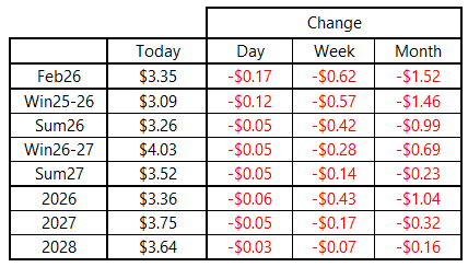 The natural gas market extended its losing streak on Tuesday, with the prompt-month February 2026 contract posting its fifth consecutive loss. Since trading to a high of $4.176 per MMBtu on its first day on the front of the curve last Tuesday, February has given up more than 80 cents, finishing this afternoon near $3.35 per MMBtu. Today’s losses were less pronounced further out the curve, with Summer 2026 and Winter 2026-27 giving up just $0.05 per MMBtu.
