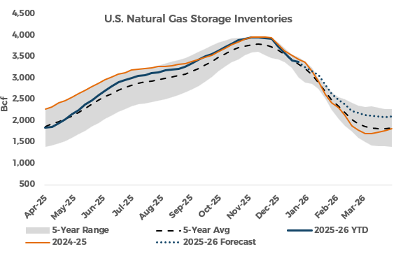 The upcoming storage report, however, covering the week ended January 2, is expected to show a much larger draw than the prior week. On the heels of a 38-Bcf withdrawal for the week ended December 26, inventories likely declined by closer to 120 Bcf during the following week. This would cut the surplus to the five-year average by more than half and widen the deficit to year-ago levels. Inventories declined rapidly during January 2026, losing nearly 1 Tcf over the course of the month. That pace looks highly unlikely to repeat based on current forecasts, suggesting stocks could move to a meaningful surplus versus year-ago levels by the end of this month.