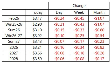 NYMEX natural gas futures ended the week sharply lower, with contracts for delivery out through November 2026 settling on Friday at multi-year lows. The largest declines were seen on the front end of the forward curve, with the February and March 2026 contract (representing the balance of Winter 2025-26) ending the day down more than $0.20 per MMBtu. That strip has lost more than $1.00 per MMBtu over the past month of trading.