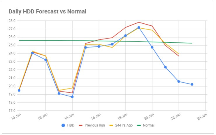 The main driver of the losses has been the warming weather forecasts. The most recent 15-day outlook stands in stark contrast to some of the forecasting model outputs earlier in the week, which suggested the U.S. could be facing another round of arctic air across the Midwest and East Coast later in January. The probability of a much-colder end to the month dropped substantially over the past few days as the forecasts have evolved to show another warmup on tap for the last 10 days of the month. The daily Heating Degree Day (HDD) forecast from today’s 12z European Ensemble Mean, along with the previous two forecasts and 10-year normal HDDs, are charted below showing the forecasted drop in heating demand beginning on Jan 20th.