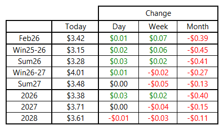 Natural gas prices held on to yesterday’s gains, finishing nearly unchanged on Tuesday near the middle of the daily trading range. The February 2026 NYMEX contract bounced around in a range of nearly 20 cents before ending the day up $0.01 per MMBtu and about $0.12 off the intraday low. Contracts further out the curve followed suit, mostly posting very slim gains on the day.