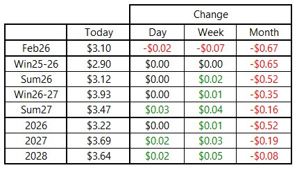 NYMEX natural gas futures ended the day very close to the previous day’s settlement, despite cooling near-term temperature forecasts featuring the coldest days of the season so far. The prompt-month contract ended down on the day, losing $0.025 per MMBtu to close at $3.103 while retaining a significant premium to March at just over $0.40 per MMBtu. The upcoming Summer and next Winter were both mixed from a monthly perspective but each averaged out to settle flat on the day.
