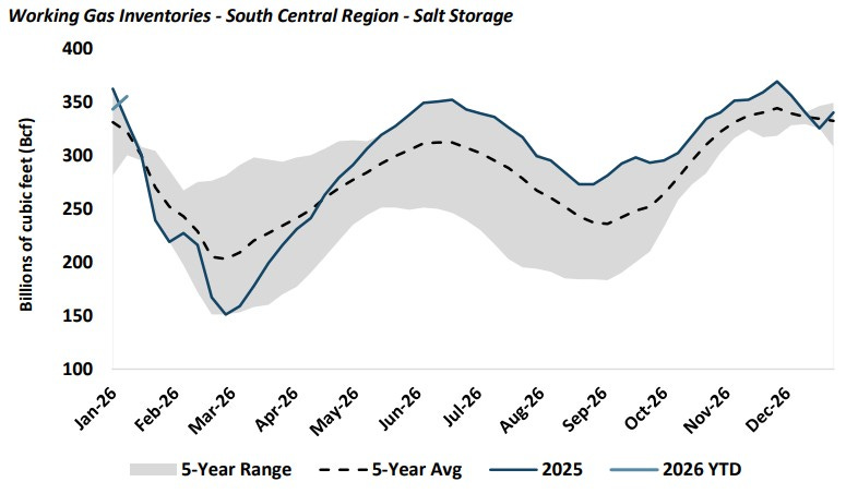 To the last point, as of the most recent report, salt storage sits at 355 Bcf - just 16 Bcf below the seasonal peak recorded in November. If salt inventories remain at elevated levels into the spring shoulder season, the physical cash market in the region that includes the Henry Hub - the delivery point for the NYMEX futures contract - could lose a very important source of demand. Without salt storage buyers in the market, daily cash pricing could trade to extremely low levels in March, April, and May, likely one of the reasons those months remain discounted to February (which still has some weather risk premium built into the price) and June - October 2026.