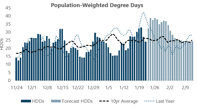 The coldest days of the season on a population-weighted basis are expected from January 24-27, but the entirety of the upcoming 10-day period is expected to show much colder-than-normal temperatures. Forecasts currently show conditions normalizing around February 4, but that outlook comes with significant uncertainty. For now, the market is bracing for extended cold, and it will likely take concrete evidence of a major shift back to widespread mild weather to turn the tides for February gas.