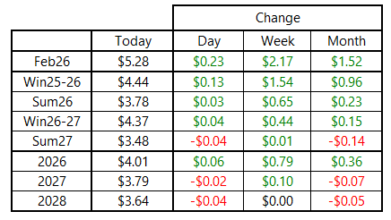 Natural gas futures extended the recent rally on Friday, posting a fourth straight day of steep gains. Prompt-month futures finished up $2.18 per MMBtu on the week, rising more than 70% from last Friday’s settlement. This is by far the largest weekly percentage jump for a front-month natural gas contract in the history of NYMEX trading. The $2.18-per-MMBtu absolute increase is the second-largest weekly gain on record, trailing only the week ended November 28, 2005, when natural gas was trading near $14 per MMBtu.