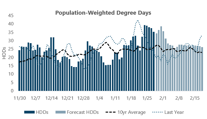 With demand still elevated and production volumes recovering but remaining below pre-cold snap levels, the overall fundamental balance is expected to remain tight heading into the upcoming weekend. Temperature forecasts now show Saturday nearly on par with the coldest days of the season so far on a population-weighted basis. Even as temperatures revert closer to normal during the first week of February, a cold bias is expected to remain in place over key population centers in the eastern half of the country.