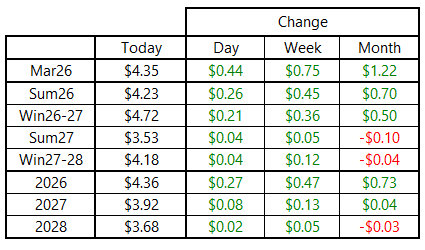 The Summer 2026 strip, which continues to rally in response to dwindling end-of-season storage estimates, pushed firmly back above $4.00 and returned to its December highs near $4.25 per MMBtu.