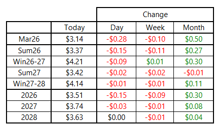 With an extended stretch of mild weather expected across the eastern three-fourths of the U.S., natural gas prices continued to fall on Monday. The March 2026 contract experienced the steepest declines, losing $0.28 to settle at $3.14 per MMBtu, while the Summer 2026 strip gave up 15 cents. Losses were less pronounced further out the curve.