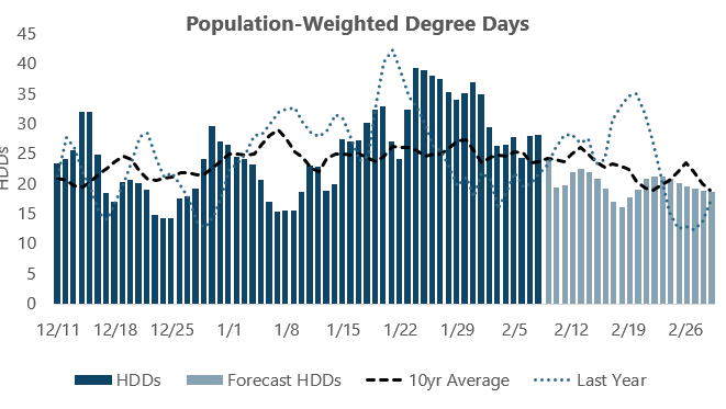 The inventory trajectory shifted materially due to the recent extended bout of extreme cold. Stocks had been positioned to finish the winter at a very strong surplus. Amid the worst of the cold—when no clear end was showing up in near-term outlooks—the market began bracing for the possibility that extreme weather could push deep into February, potentially leaving storage levels in a more precarious position this spring. With those fears now abated and the market looking toward near-average end-of-winter stocks, the forward curve has reset accordingly.
