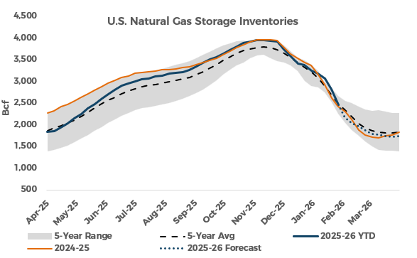 However, absent any additional major cold shots, inventories should still exit the winter near year-ago and five-year average levels. Pinebrook currently projects an end-of-winter inventory level between 1.7 and 1.8 Tcf.