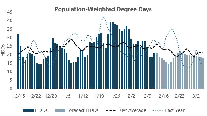 Weather-related demand is expected to remain subdued into late February, significantly diminishing winter risk for the balance of the peak season. Storage inventories, which fell into a deficit versus last year and the five-year average during the recent cold event, should recover in the coming weeks and finish the season near historical benchmarks.