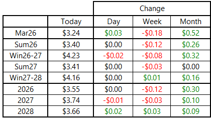 Friday was another relatively quiet day of trading in the natural gas market. The March 2026 contract looked poised for losses this morning, pushing as low as $3.11 per MMBtu. However, prices firmed through most of the session to finish near $3.24 per MMBtu, up about 3 cents on the day. Beyond the prompt month, price action was fairly subdued, with Winter 2026–27 losing $0.02 per MMBtu, while other seasonal strips through Winter 2027-28 finished the day unchanged.
