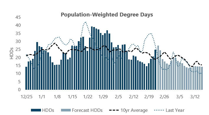 Monday is the coldest on a population-weighted basis in more than two weeks, with HDDs matching levels experienced at the tail end of the major cold snap that started in mid-January and lingered into early February. After one more day of frigid weather, HDDs are forecast to fall off sharply beginning on Wednesday, with warmer-than-normal temperatures expected to stick around deep into March.