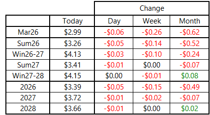 Prices slid lower throughout the day on Monday, with the March 2026 contract ultimately finishing just below $2.99 per MMBtu. This marks the lowest daily settlement for that contract since January 16, and could be an indication that the dam of support surrounding $3.00 per MMBtu is in danger of being breached. March was down just 6 cents on the day, but settled about $0.26 per MMBtu off the intraday highs.