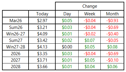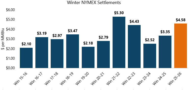 The March 2026 contract rolled off the board after another quiet day of trading, edging modestly higher to expire at $2.969 per MMBtu. This marks the lowest NYMEX contract expiration since October and brings the Winter 2025/26 average to $4.583 per MMBtu. That average, of course, was dramatically influenced by February’s elevated $7.46 per MMBtu expiration. Even so, the $4.583 average winter settlement is the highest since the 2021–22 season and the second highest since 2010.