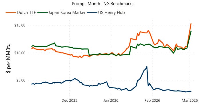 U.S. futures are up relatively modestly since the end of last week, while other global benchmarks have skyrocketed. April Dutch TTF futures were up more than 70% in two trading days, rallying from about $11 as of Friday to more than $18 per MMBtu on Tuesday. Benchmark Asian futures have seen similar gains as the reality of a potential extended supply disruption sets in.