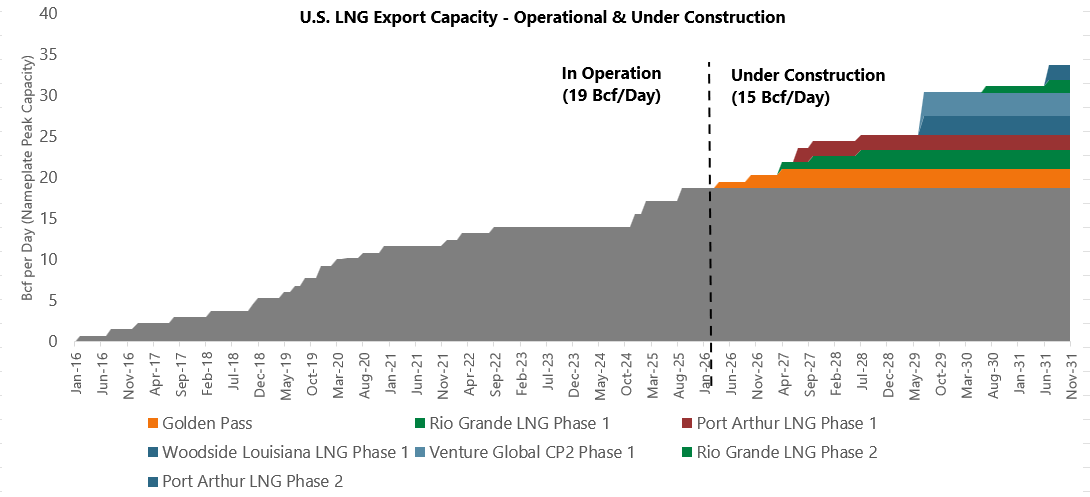 Beyond the 2.4-Bcf-per-day Golden Pass terminal, the other terminals that are currently listed as “under construction” have a combined capacity of more than 12.5 Bcf per day scheduled for completion over the next five years.