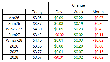 U.S. natural gas prices pushed to the upside for the second straight day, with the April 2026 contract breaking back above $3.00 per MMBtu resistance. April added 9 cents to finish the day at $3.05 per MMBtu, with gains spread evenly across the curve through Winter 2026–27. Prices were higher earlier in the session, but the market pared some of the gains into settlement to finish well off the intraday highs.