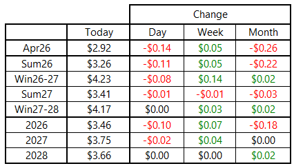 Natural gas futures retreated on Wednesday, with the prompt-month April 2026 contract declining by 14 cents to finish the day at $2.92 per MMBtu — firmly below the key $3.00 benchmark. Losses were less pronounced further across the curve, with Winter 2026-27 still sitting $0.14 per MMBtu above week-ago levels.
