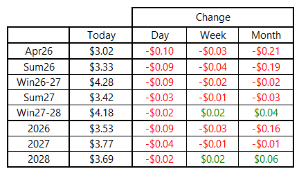 Natural gas prices finished lower for the second consecutive day, with the front of the curve ending Tuesday back near $3.00 per MMBtu. The prompt-month April 2026 contract settled at $3.02, down about $0.10 per MMBtu on the day. Overall, futures through Winter 2026–27 ended Tuesday close to yesterday afternoon’s intraday lows.