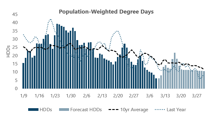 Domestic production remains near record highs above 110 Bcf per day, and demand is very much on the downtrend into the spring shoulder season. We’ve seen some colder shifts in near-term temperature forecasts, which could lead to more robust March storage draws than initially expected, but we do not expect these weather patterns to have a material impact on the overall inventory situation. Storage levels are on track to round out the winter near five-year average levels.