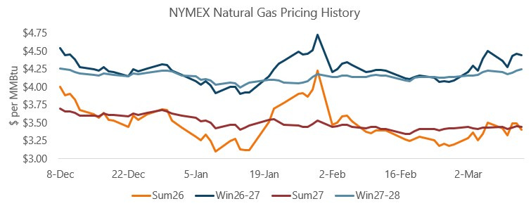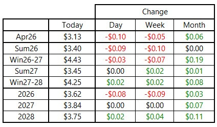 The front of the NYMEX natural gas futures curve ended the day lower, with the April 2026 contract falling by $0.10 per MMBtu to end the week at $3.13 per MMBtu. Deferred deliveries also saw declines, although to a lesser extent, with Summer 2026 falling by $0.09 per MMBtu to close at $3.40 and Winter 2026/27 losing $0.03 per MMBtu to finish at $4.43. Today’s loss helped push futures pricing for the next 12-months to a loss on the week, while subsequent seasons ended slightly higher than last Friday’s settlement price.