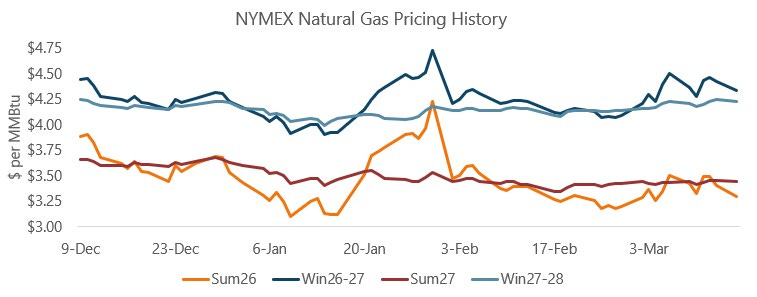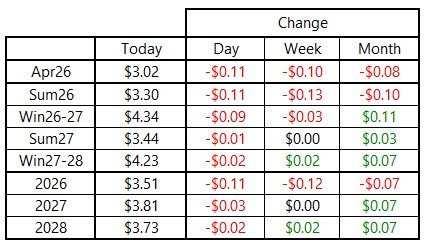 Natural gas futures prices ended lower today, with the April 2026 contract falling by $0.11 to settle at $3.02 per MMBtu. The rest of the Summer 2026 strip saw similar declines while deferred deliveries were only slightly lower relative to Friday’s settlement.