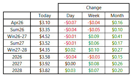 NYMEX futures finished lower on Friday, as the U.S. market continues to be mostly insulated from global volatility. The prompt-month April 2026 contract ended the day near $3.10 per MMBtu, roughly in the middle of the weekly trading range between $2.92 and $3.27 per MMBtu. Winter 2026–27 was down just 1 cent on the day but still finished the week higher, in contrast to contracts closer to the front of the curve.