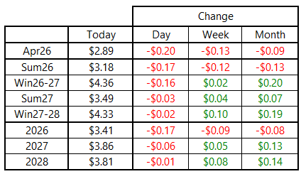 Benchmark U.S. natural gas futures traded sharply lower on Monday. The April 2026 contract settled near $2.89 per MMBtu, down about 20 cents on the day. This marks the lowest daily close for that contract since its first two days at the front of the curve in late February. Losses were spread relatively evenly across the curve through Winter 2026–27, with deliveries beyond next March posting only marginal declines.