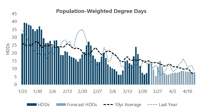 Market participants spent Tuesday navigating conflicting signals. On one hand, global energy sentiment turned bullish again as optimism surrounding an imminent resolution to the conflict in the Middle East faded, with the U.S. reportedly deploying troops to the region. However, bearish domestic fundamentals helped mute any spillover into the NYMEX market. Temperatures through at least the first week of April are expected to be mild across most key population centers, which should limit demand as the market transitions into injection season and likely promote strong early builds into underground inventories.