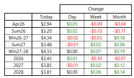 U.S. natural gas prices edged higher on Tuesday, with the prompt-month April 2026 contract adding 5 cents to settle near $2.94 per MMBtu. The rest of the curve was little changed, with Winter 2026–27 and Summer 2027 giving up modest ground on the day. Despite these slight declines, those strips remain relatively strong compared to the front of the curve when viewed against week-ago and month-ago levels.