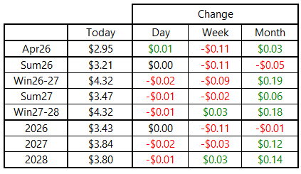 NYMEX natural gas futures were virtually unchanged on Wednesday following a quiet trading session, with little volatility across the curve. The April 2026 contract was less than 1 cent higher, finishing just above $2.95 per MMBtu, while the rest of the curve was flat to modestly lower on the day.