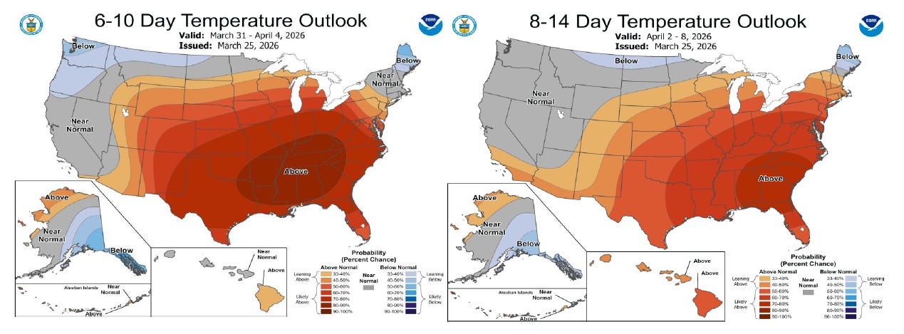 The muted price action came as the market assesses a major warming pattern set to move across the eastern half of the country in the coming days. This will primarily limit heating demand in late March and early April, while beginning to drive the year’s first meaningful cooling demand in some southern markets.