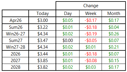 The prompt-month contract failed to establish momentum above $3.00 resistance and settled at $2.999 per MMBtu. Tomorrow’s price action surrounding the April 2026 contract expiration should provide further clarity on the strength of overhead resistance and may help dictate overall market direction heading into next week.
