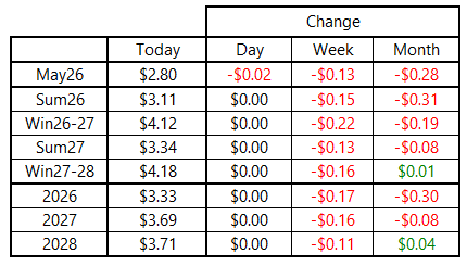 Natural gas prices finished the holiday-shortened week on a quiet note, with the prompt-month contract down marginally and contracts beyond the front of the curve virtually unchanged. This capped a week in which pricing drifted lower across the curve, with May 2026 moving further away from $3.00 resistance and ending near $2.80 per MMBtu.