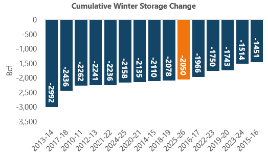 Today’s storage report marked the end of the traditional winter season for natural gas, with inventories posting a net build of 34 Bcf for the final full week of March. This capped a withdrawal season that featured a record weekly pull from storage in January, as well as a record three-week stretch of storage deductions during the extended cold snap. Even with this historic period of winter draws, the overall winter pull of 2,050 Bcf still ranked in the bottom half of seasonal storage withdrawals since 2010.