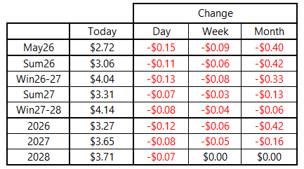 NYMEX natural gas pushed sharply to the downside on Wednesday as energy markets reacted to an announced ceasefire in Iran. The May 2026 contract fell about 15 cents to settle near $2.72 per MMBtu. This marks the lowest daily closing price for any prompt-month natural gas contract since August, with the May contract ending the day near five-year lows. Losses were less pronounced further out the curve, particularly beyond March 2027.