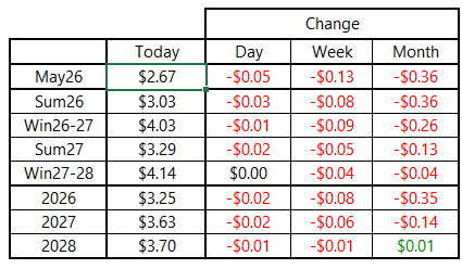 Natural gas futures continued to push lower on Thursday, with volatility remaining relatively subdued amid a lack of bullish catalysts. The May 2026 NYMEX contract lost 5 cents to finish near $2.67 per MMBtu. Losses were less pronounced beyond the front of the forward curve, with deliveries through Winter 2026–27 edging closer to the lower boundary of the 2026 trading range.
