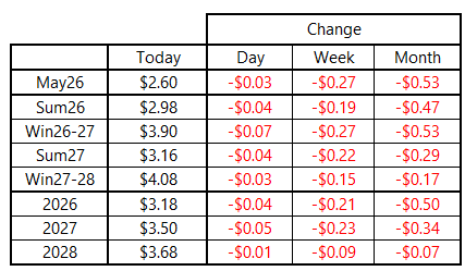 Natural gas futures continued to push lower on Tuesday amid a lack of immediate bullish fundamental drivers. The May 2026 contract ended the day just below $2.60 per MMBtu, down 3 cents. The Winter 2026-27 strip declined at a sharper clip, falling by $0.07 to settle near $3.90 per MMBtu, which is the lowest daily close for that strip since before the January cold snap. The forward market has now essentially given up any premium that had been built into the curve following that event.