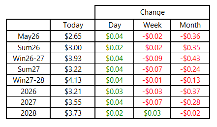 Natural gas futures finished marginally higher on Thursday, with the prompt-month May 2026 contract adding about 4 cents to settle near $2.65 per MMBtu. This marks the strongest single-day increase for prompt-month gas in more than a week, an indication of how quiet trading has been for most of April. Similar gains were recorded further out the curve, with Winter 2026-27, Summer 2027, and Winter 2027-28 also increasing by an average of $0.04 per MMBtu.