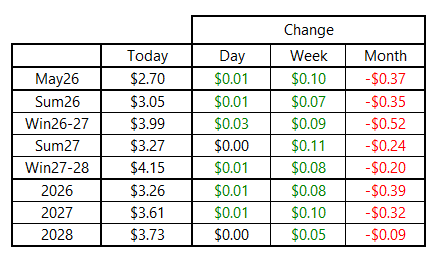 NYMEX futures continued to trade with low volatility on Tuesday. Following a week that saw a trading range of just 16 cents for the prompt-month contract, the first two days of this week has seen that range tighten further, with only $0.113 per MMBtu separating yesterday’s intraday high with today’s intraday low. The May 2026 contract finished the day less than a penny higher, with gains only slightly more pronounced for Winter 2026-27 and pricing essentially flat beyond March 2028