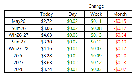Natural gas futures continued to trudge higher on Wednesday, marking the sixth straight day of slim gains for the benchmark contract. May 2026 settled about 2 cents higher near $2.72 per MMBtu, with similar gains recorded through Summer 2027. Contracts across the board are all up over the past week but remain lower than month-ago levels.