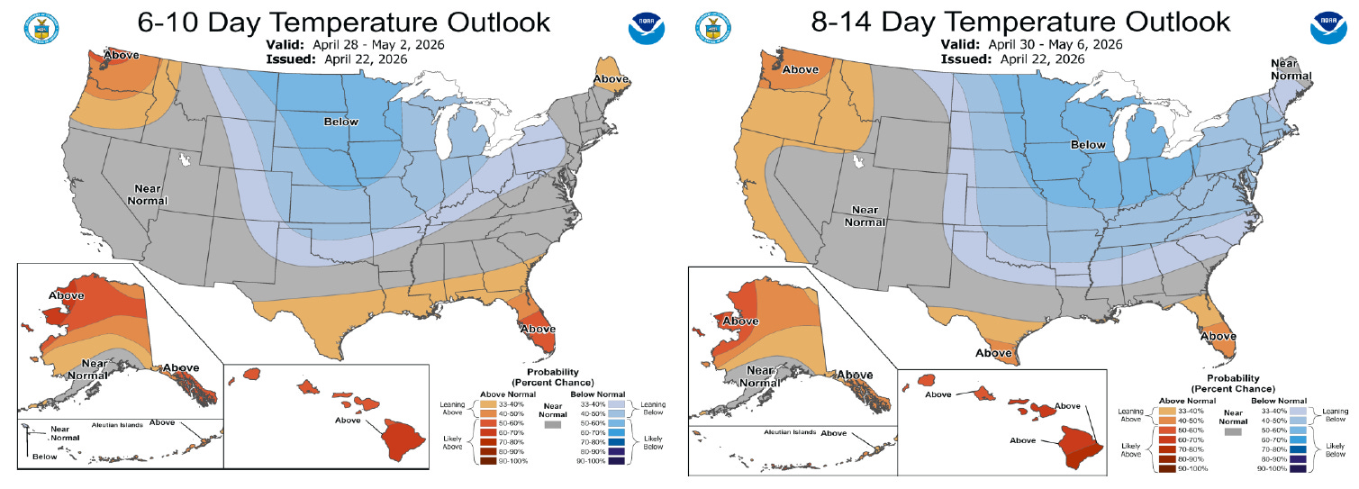 Cooler temperature forecasts for the remainder of April are conducive to lingering modest heating needs in northern market areas, but overall energy demand remains tepid. If widespread cool anomalies extend into mid-May, they will become overtly bearish by limiting early cooling demand across virtually the entire country.