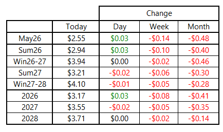 NYMEX natural gas futures appeared poised to start the week on a strong note. Nearby contracts were on track for double-digit gains overnight and through much of the morning. However, bullish sentiment faded throughout the day, and the forward curve ultimately finished with relatively modest gains. In its second-to-last trading day before expiration, the May 2026 contract added 3 cents to settle near $3.55 per MMBtu. Gains were consistent across the Balance-of-Summer 2026 strip, while contracts beyond October were flat to lower on the day.
