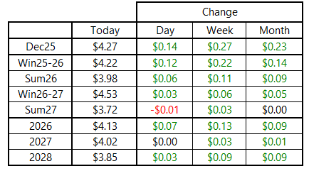 Natural gas posted its third straight day of gains since December rolled to the front of the forward curve. Prices initially relaxed from overnight highs and the market was flat for most of the morning. However, upside momentum began mounting midday and peak winter contracts all finished the day with double-digit gains. The Winter 2025-26 strip posted its highest daily settlement since July, finishing the day just below $4.22 per MMBtu.