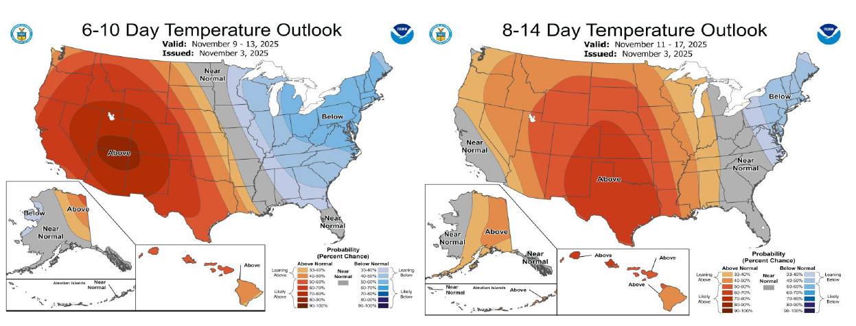 Near-term forecasts have shifted colder since late last week, with the 6-10 and 8-14-day outlooks now showing cooler-than-normal temperature conditions for the populous eastern half of the U.S. The 6-10-day period in particular has moved significantly to the cold side, adding population-weighted heating degree days for the first half of next week. The most intense anomalies relative to normal are expected from November 9th through the 11th.