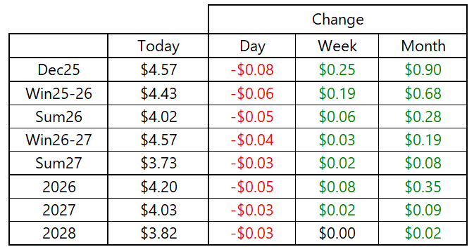 Gas futures finished lower today, giving up a portion of the week’s gains but still posting the fourth consecutive week of rising prices. The market looked poised for steep losses at points on Friday, but demonstrated resilience in the face of a bearish storage report and ahead of two weeks of mild temperature patterns. December again outpaced the rest of the winter strip, gaining 25 cents on the week compared to 19 cents for the 4-month package. Weekly gains were much more marginal beginning with the Summer 2026 strip and diminishing further for longer-dated contracts.